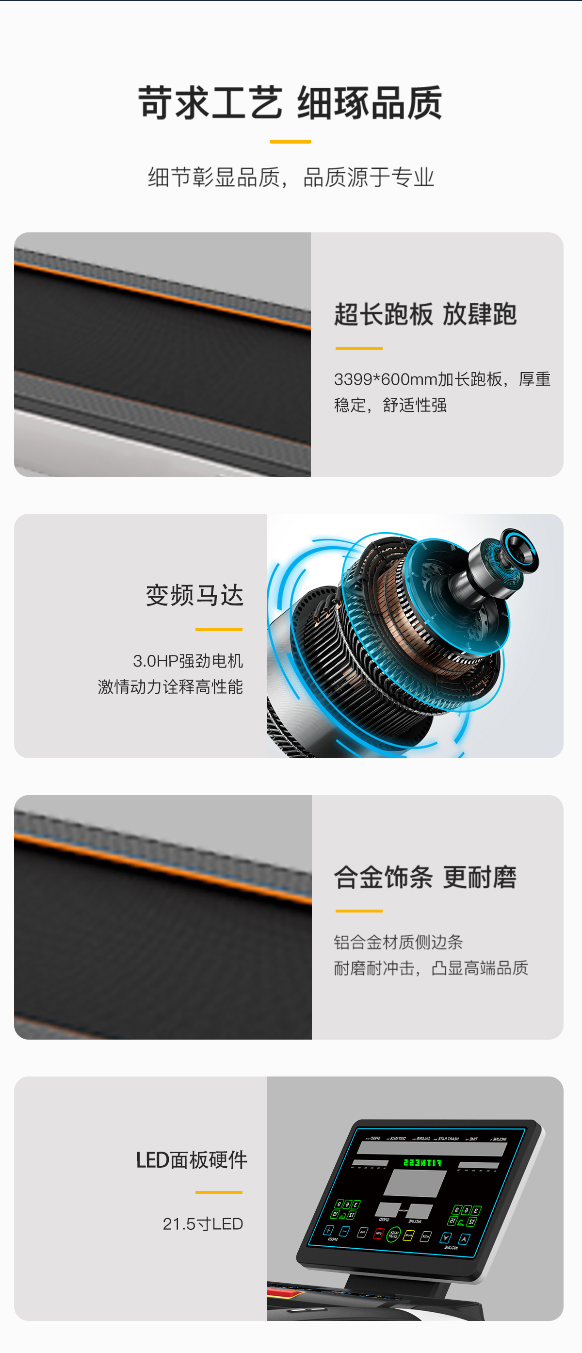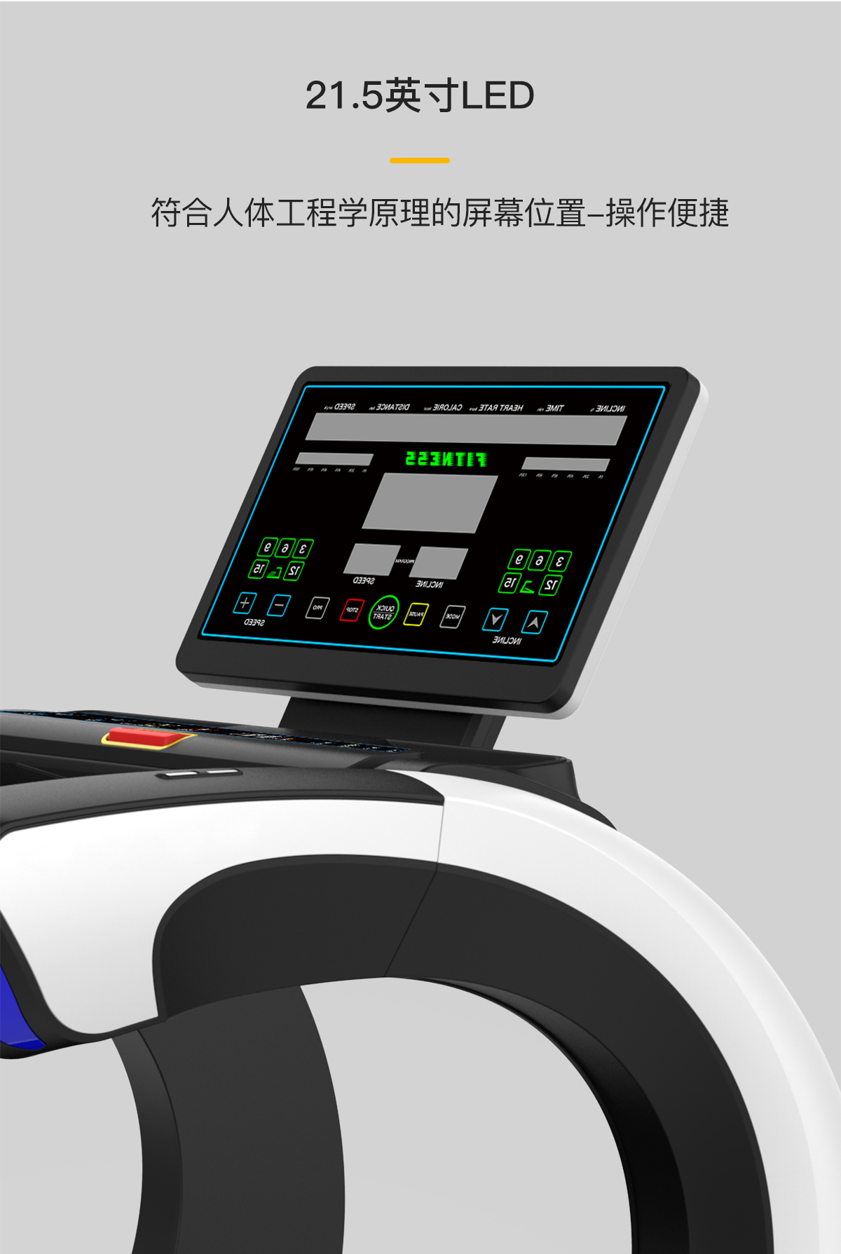 “C”造型流線型(xíng)設計(jì),現代(dài) 簡潔 科技感十足(zú),立柱(zhù)和跑台(tái)以白色為主,配(pèi)以黑(hēi)色(sè)環保材料,形成鮮(xiān)明對比,特點突出